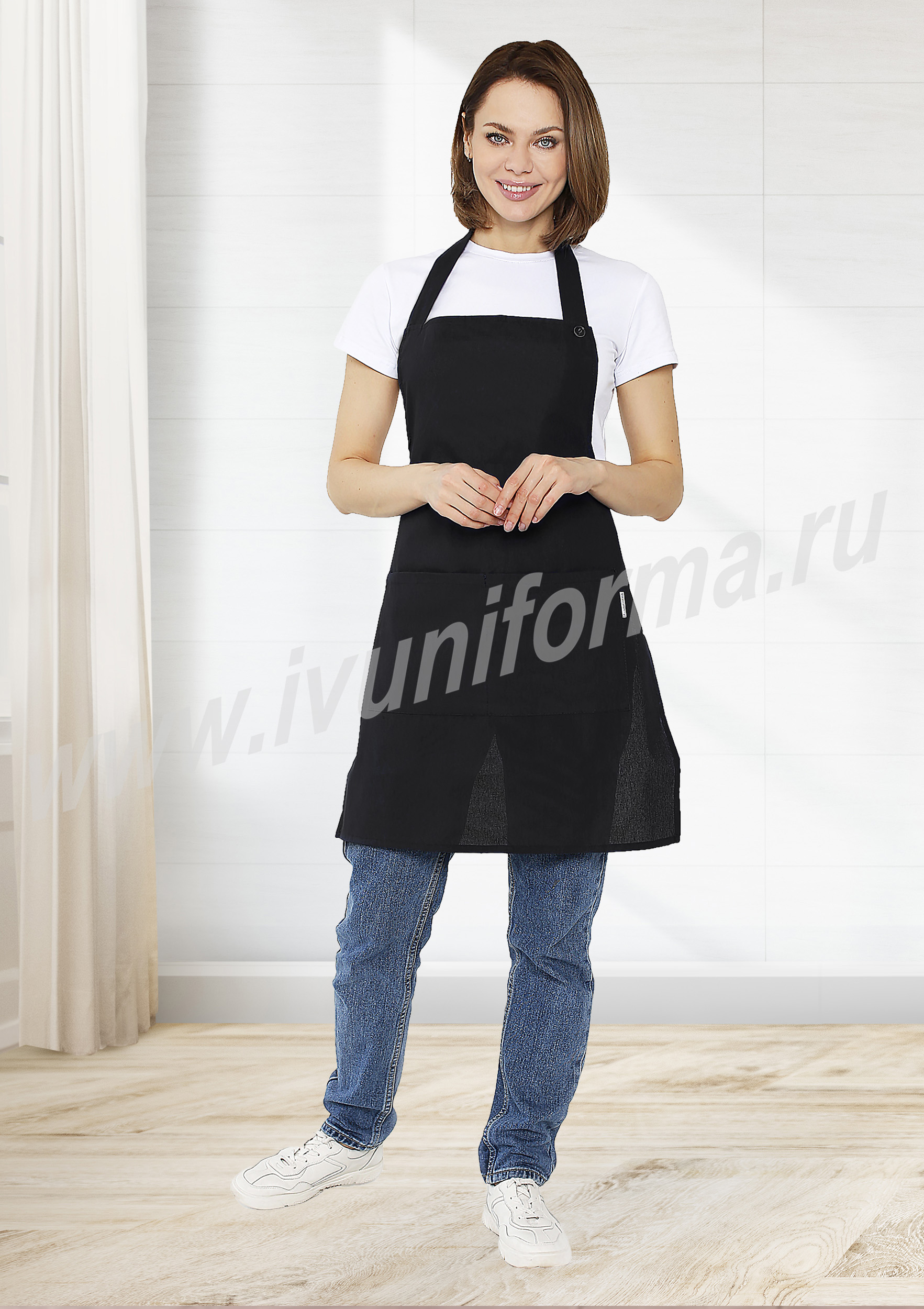 Фартук женский средней длины, с передним карманом, разделённым строчкой на две части. Удобная шейная бретель имеет регулировку по длине. Широкие пояса плотно фиксируют фартук на талии.Фартук может использоваться в составе защитного комплекса или является частью корпоративной формы.